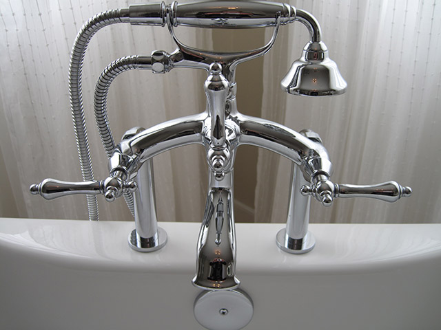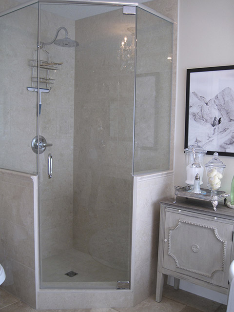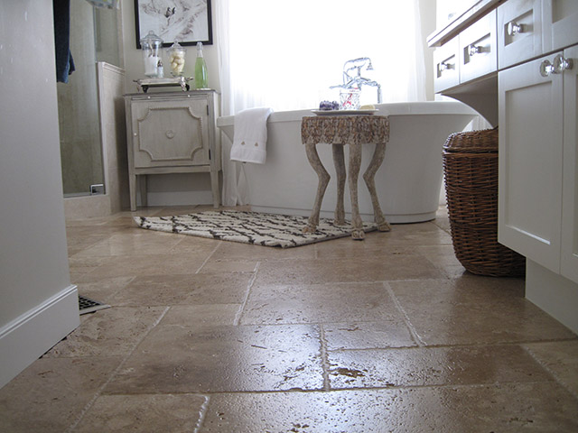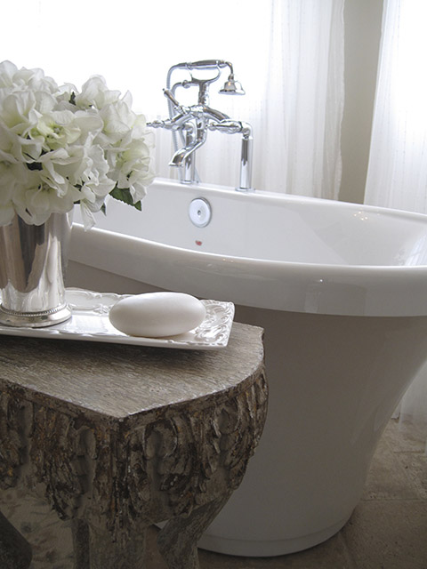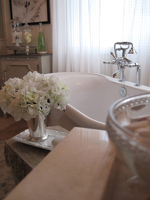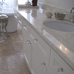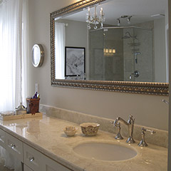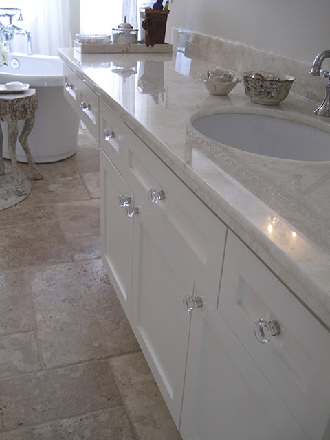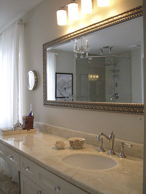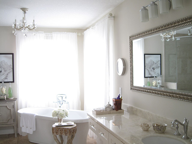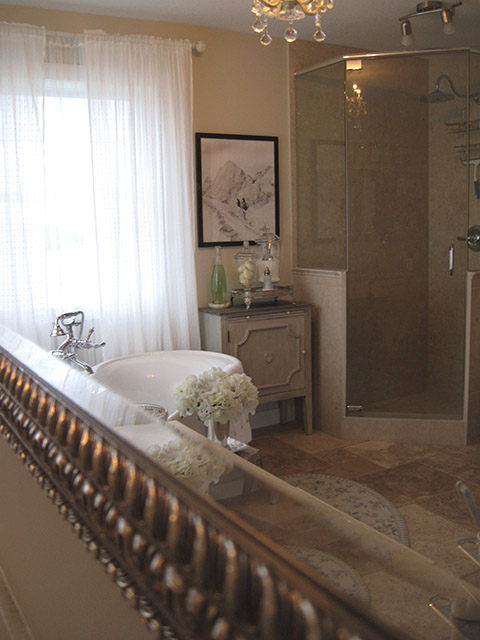 Inspired by the swirling creams and whites in the new Onyx counter, this complete renovation transformed this dreary bath into a serene retreat. The dramatic transformation in this Bearspaw ensuite began with a complete gutting and removal of dated carpet, counter, a massive corner tub and a small corner shower. Honed travertine tile was installed in a classic Versailles pattern and a deep freestanding tub was installed with a traditional telephone handle tap. The new shower was enlarged and tiled with oversized tile and a rain showerhead. The vintage look crystal chandelier added just a touch of sparkle. A truly beautiful space.