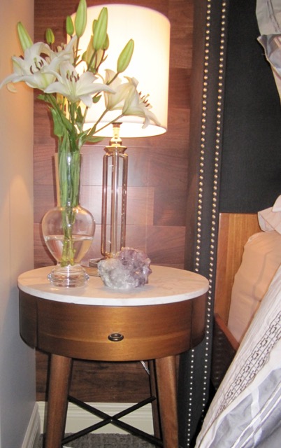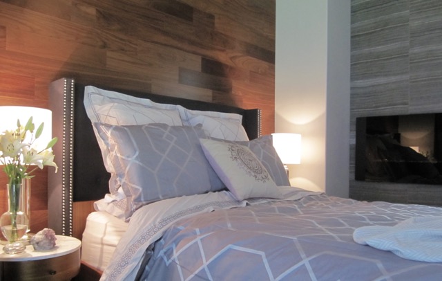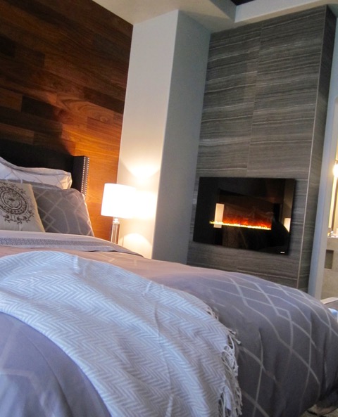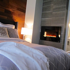 There is beauty in simplicity. Our design revolved around treasured heirloom mid-century modern bedroom furniture. We began with new broadloom, lighting, custom drapery and a walnut plank feature wall. A custom platform was built to raise the low-profile bed and we added a charcoal grey linen headboard. Luxurious linens were the final element of this beautiful bed. Marble top bedside tables and crystal lamps completed the furniture ensemble. The grand finish was the addition of a linear glass fireplace and floor to ceiling tiled fireplace wall. Cool nights are now cozy.