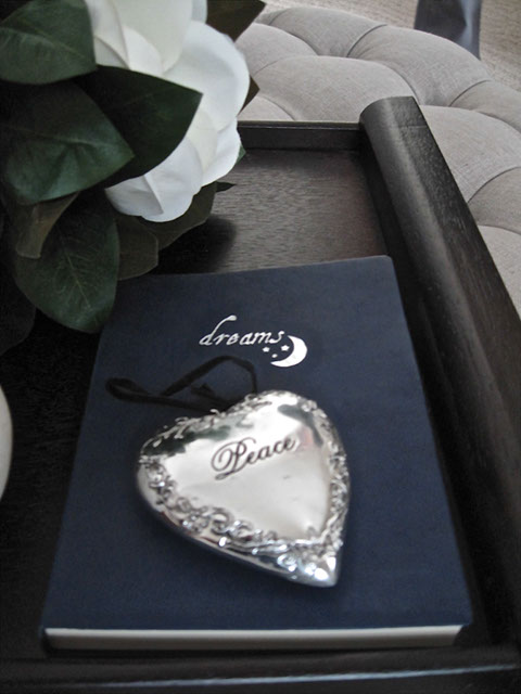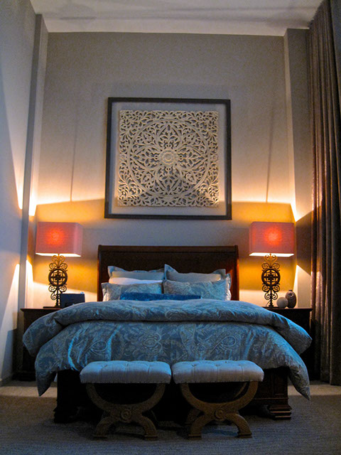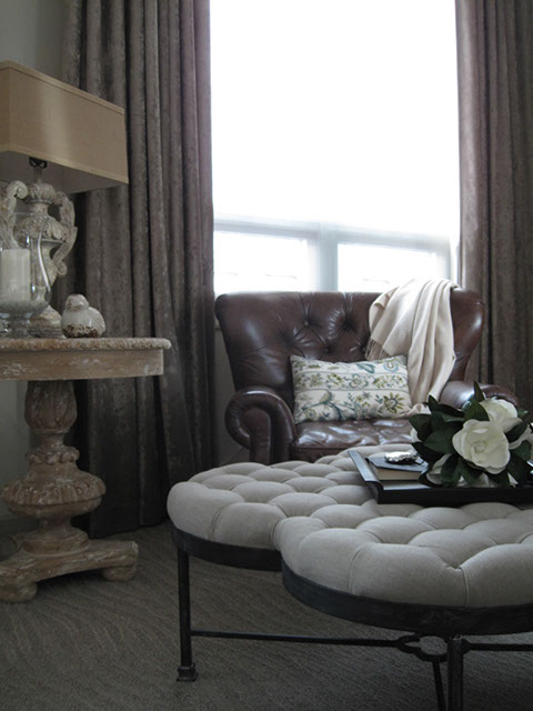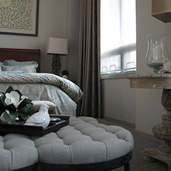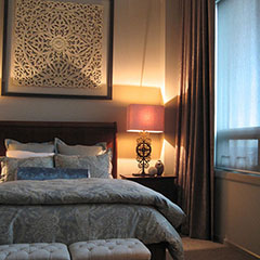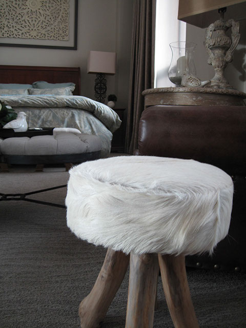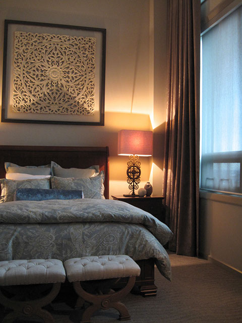 This penthouse master bedroom is perched on the 34th floor of a tower in downtown Calgary. The objective was to create a serene retreat in this grand room that spans a length of 22’ and has voluminous 14’ ceilings. Working with an existing bed and night tables we created a statement focal point by framing an intricate wood carving above the bed. Luxurious mink coloured velvet drapery was custom made and hung wall to wall and floor to ceiling. A traditional leather library chair and weathered wood table were the inspiration for the cozy reading area. Textures of linen, alpaca and white cow hide are featured in the accents. I think we can say tranquility.