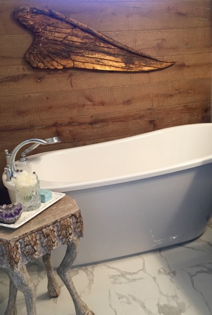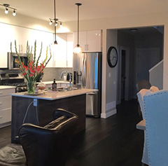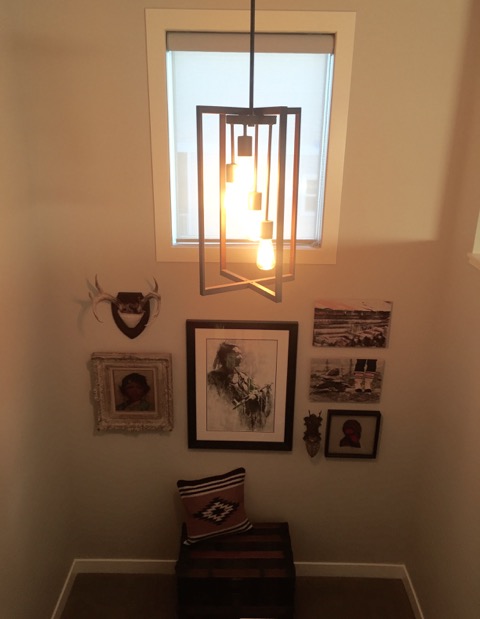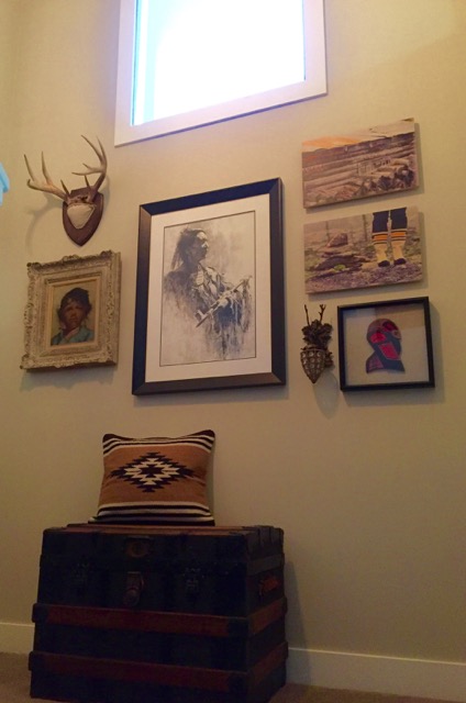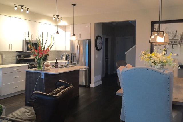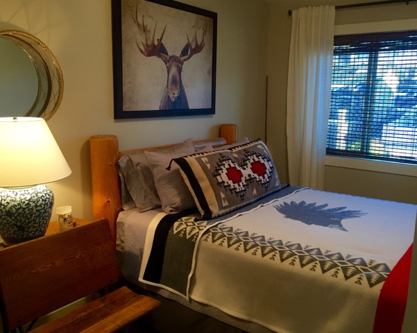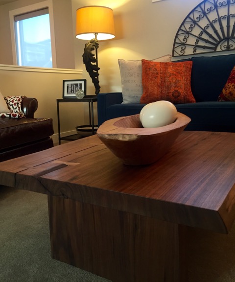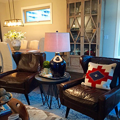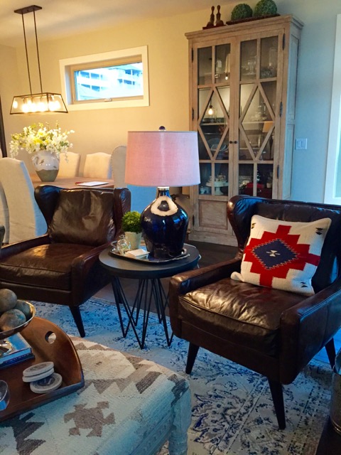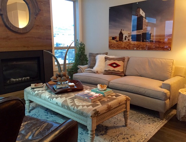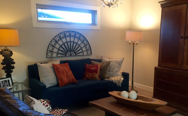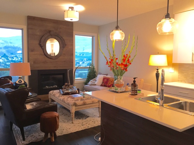 This petite gem sits on a ridge overlooking beautiful vineyards, orchards and Lake Okanagan in Vernon, British Columbia. Paying homage to the homeowner’s Alberta roots, a large print of an Alberta grainery and a vintage print of curlers on the Banff Overflow were placed on the main floor. The scale of the art is balanced by the oversized reclaimed wood dining table and oversized kilim ottoman in the adjoining family room. The fireplace and feature wall in the en-suite bath are clad in rustic plank hardwood. Luxurious textures complete the bonus room. A blue velvet sofa, weathered leather chair, custom live edge walnut coffee table and woven textiles create a rustic yet elegant décor. So many hidden treasures abound!
